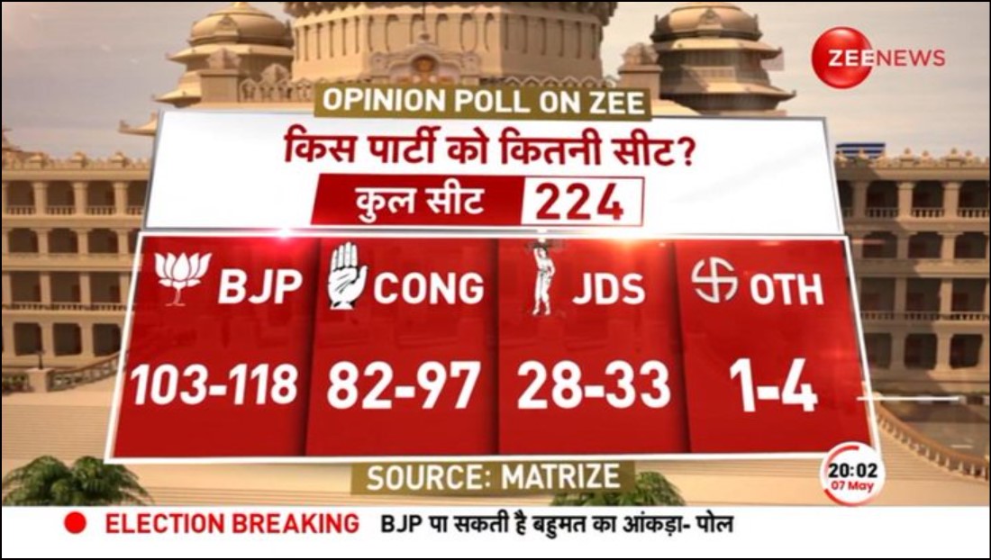 Zee TV announced the results of its opinion poll conducted in association with an organization called Matrize. According to the survey, the incumbent BJP will once again form the government in Karnataka, by comfortably crossing the clear majority.