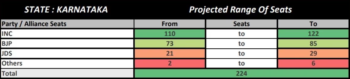 India TV announced the final results of the survey and opinion poll conducted in association with an organization called CNX. The survey shows that the Congress party may emerge as the single largest party in the Karnataka assembly elections, but may fall eight seats short of a clear majority.