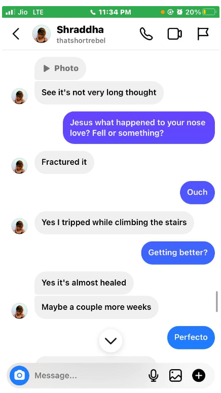 One Instagram chat story between Shraddha and her friend is also making rounds on social media in which Shraddha is seen hiding the incident in which she was brutally beaten by Aftab. Shraddha happened to send him/her the photo in which she had attained bruises to which her friend said, “Jesus what happened to your nose love? Fell or something?” Shraddha replied that she fractured it as she fell from the stairs.