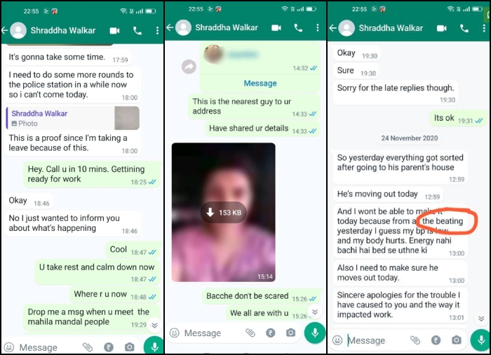 In yet another WhatsApp chat with another acquaintance, Shraddha is seen sharing her bruised image to which the friend says, “Bacchae don’t be scared. We all are with you.” Walkar further says, “It’s gonna take some time. I need to do some more rounds to the police station in a while now so I can’t come today.” Walkar is asked to meet the Mahila Mandal people in reply and move out of the house.