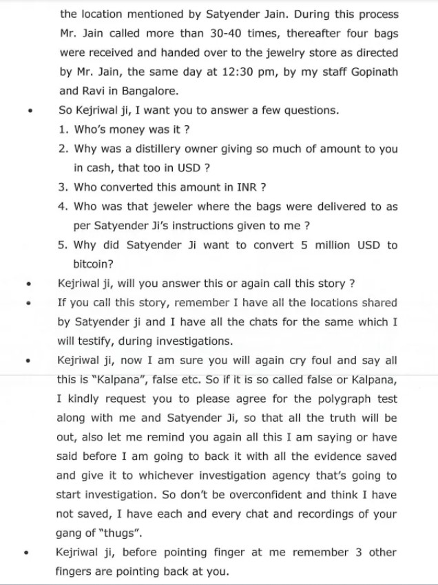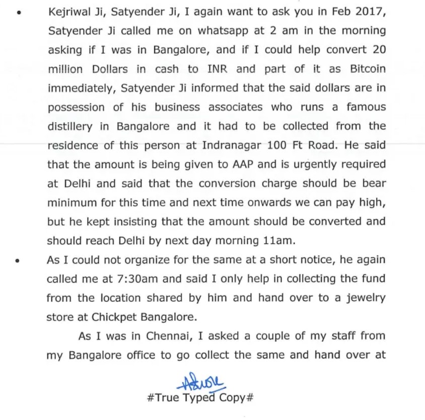 Sukesh Chandrashekhar stated that Jain called him at 2 am in February 2017 asking for his assistance in converting $20 million in Indian rupees and bitcoin. The AAP politician, according to the conman, indicated that the money must be collected from his business associates who operate a well-known distillery in Bengaluru.