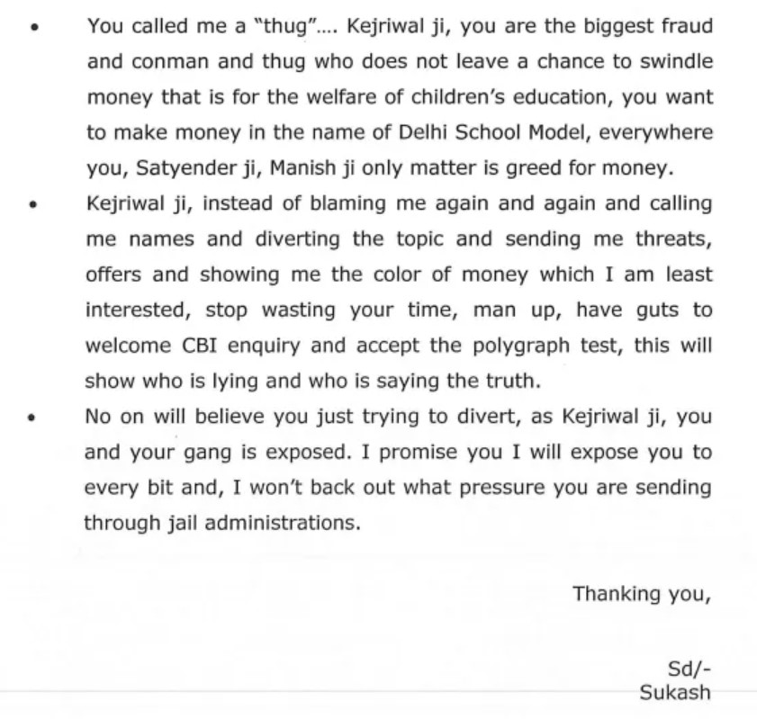 After mentioning that this money is being given to the AAP, Jain allegedly demanded that it be converted and brought to Delhi by 11 am, said Sukesh Chandrashekhar in his letter.