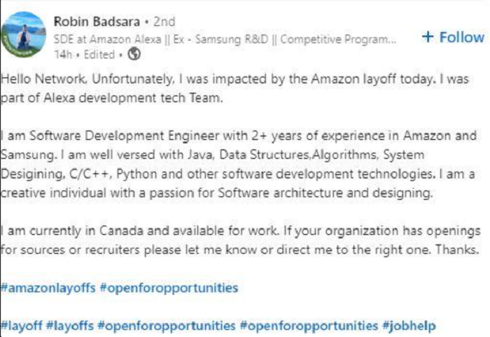 In addition to the United States, numerous Indians working for Amazon in Canada have also been laid off. Robin Badsara, a Software Development Engineer at Amazon’s Canada headquarters said that he was also laid off. “Hello Network, Unfortunately, I was impacted by the Amazon layoff today. I was part of the Alexa development tech Team…. I am currently in Canada and available for work. If your organization has openings for sources or recruiters, please let me know or direct me to the right one. Thanks,” Badsara’s LinkedIn post read.