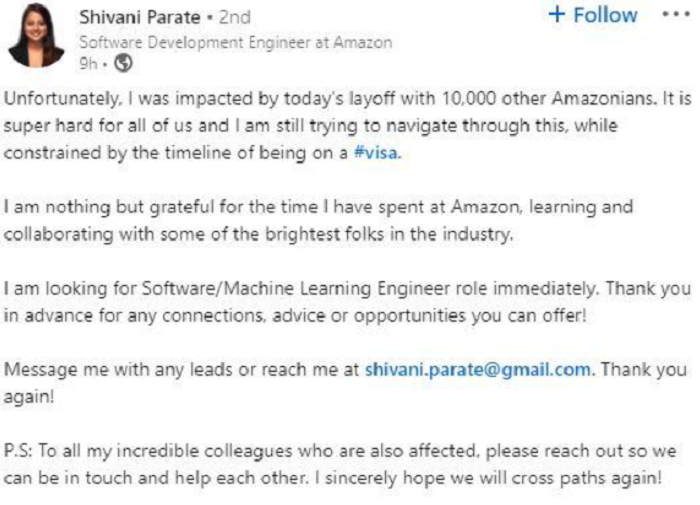 Another former Amazon employee named Shivani Parate who worked as Software Development Engineer at Amazon for nearly 2.5 years said that she was laid off and that was looking for an employment opportunity in the US. “Unfortunately, I was impacted by today’s layoff with 10,000 other Amazonians. It is super hard for all of us and I am still trying to navigate through this, while constrained by the timeline of being on a #visa. I am nothing but grateful for the time I have spent at Amazon, learning and collaborating with some of the brightest folks in the industry,” Parate’s LinkedIn post read.