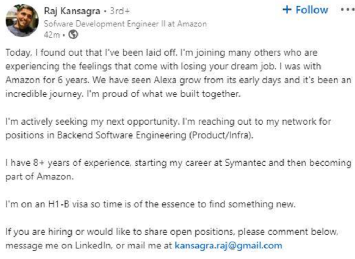Taking to LinkedIn, Raj Kansagra, former Software Development Engineer II at Amazon Alexa team said that he was actively looking for a job since he is the holder of an H1B visa. “Today, I found out that I’ve been laid off. I’m joining many others who are experiencing the feelings that come with losing your dream job. I was with Amazon for 6 years. We have seen Alexa grow from its early days and it’s been an incredible journey. I’m proud of what we built together. I’m on an H1-B visa so time is of the essence to find something new,” Kansagra wrote.