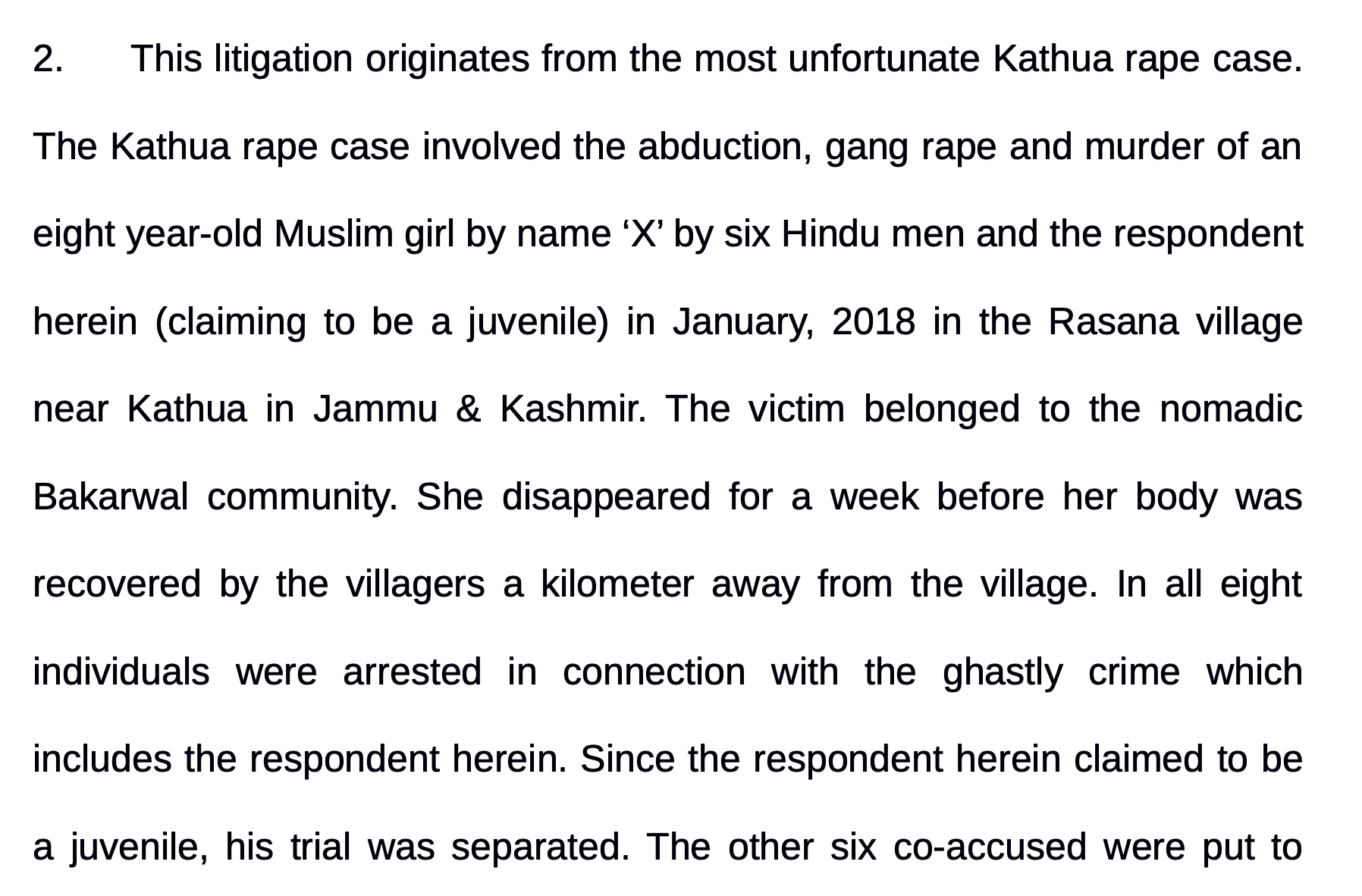 “This litigation originates from the most unfortunate Kathua rape case. The Kathua rape case involved the abduction, gang rape and murder of an eight year-old Muslim girl by name ‘X’ by six Hindu men and the respondent herein (claiming to be a juvenile) in January, 2018 in the Rasana village near Kathua in Jammu & Kashmir”, the court said in the second para of the order passed on 16th November 2022.
