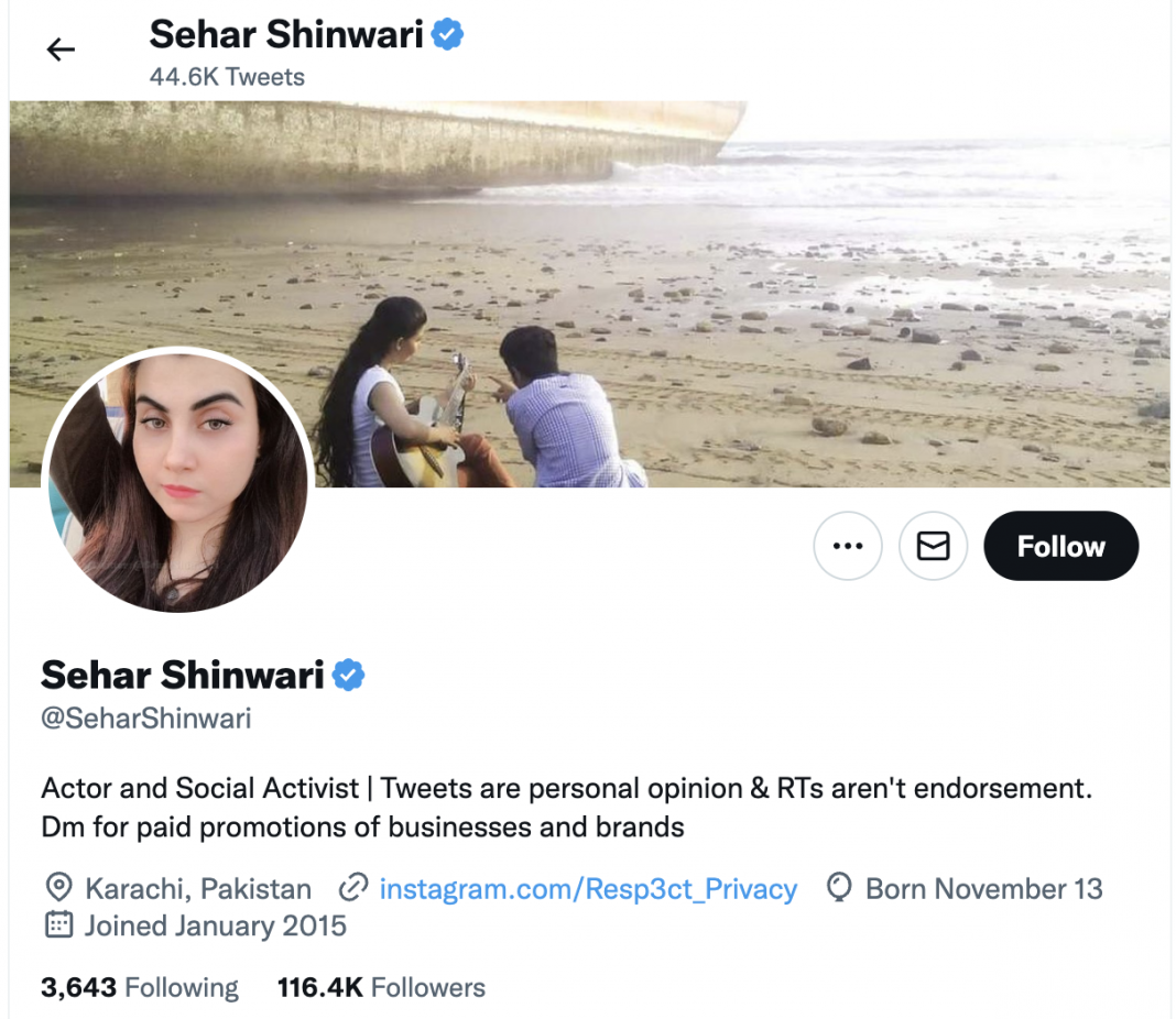 Sehar Shinwari, who clearly seems very much clued in on Indian politics, has a verified Twitter account. However, very little of her is actually known. There is no media articles, no videos on YouTube which acknowledge her as an actress.