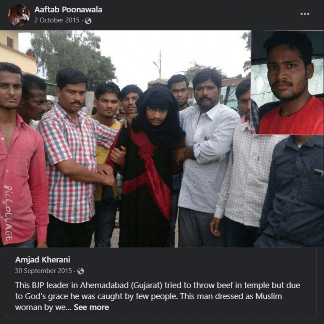 In October 2015, he shared a post, which claimed that an alleged BJP worker (dressed in burqa) tried to throw beef inside a temple and create a Hindu-Muslim divide.