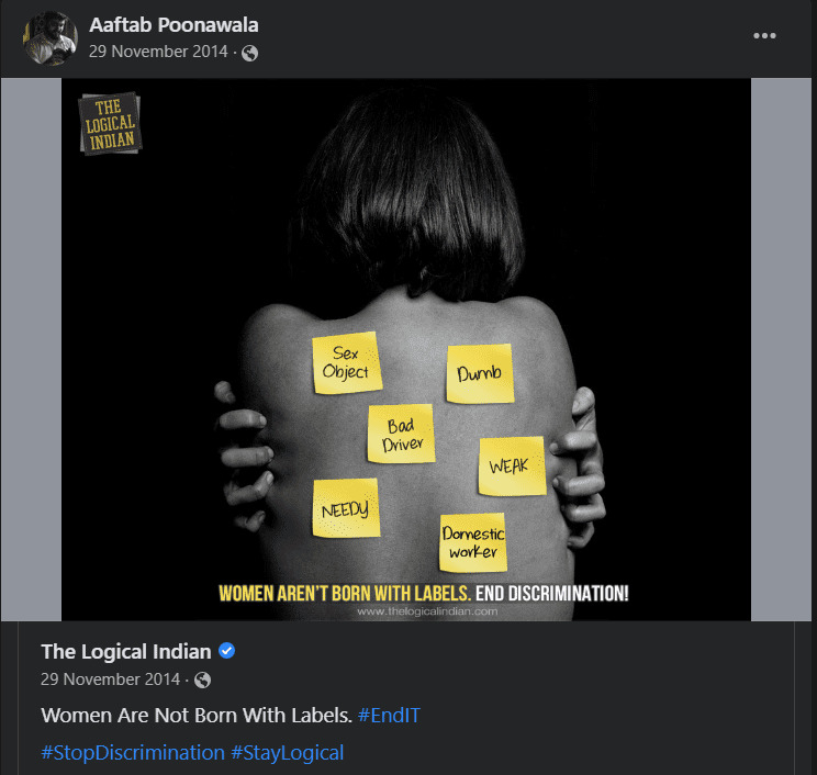 As ironic as it may sound, Aftab Amin Poonawalla was also a ‘women’s rights activist.’ In 2014, he shared a post by ‘The Logical Indian’ that read, “Women are not born with labels.”