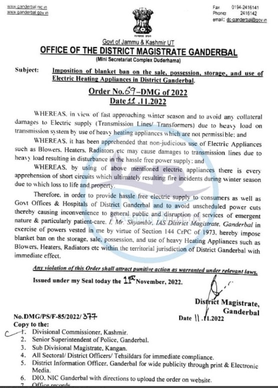 “Therefore in order to provide hassle-free electric supply to consumers as well as government offices and hospitals of district Ganderbal and to avoid unscheduled power cuts thereby causing inconvenience to the general public and disruption of services of emergent nature and particularly patient-care. I, Mr Shyambir, IAS District Magistrate, Ganderbal in the exercise of powers vested in me by virtue of Section 114 CrPc of 1973, hereby impose a blanket ban on the storage, sale, possession, and use of heavy heating appliances such as blowers, heaters, radiators etc within the territorial jurisdiction of District Ganderbal with immediate effect,” the order reads.