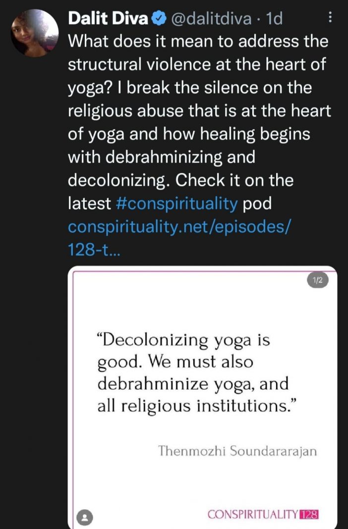 In a tweet, she claimed, “What does it mean to address the structural violence at the heart of yoga? I break the silence on the religious abuse that is at the heart of yoga and how healing begins with de-brahminising and decolonizing. Check it on the latest #conspirituality podcast.”