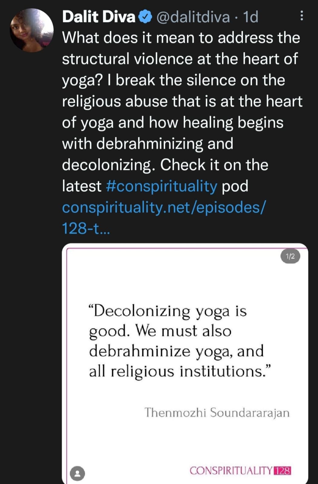 The archived version of the tweet can be accessed here. The anti-Brahmin activist participated in a podcast, hosted by one Matthew Remski and titled ‘Conspirituality.’