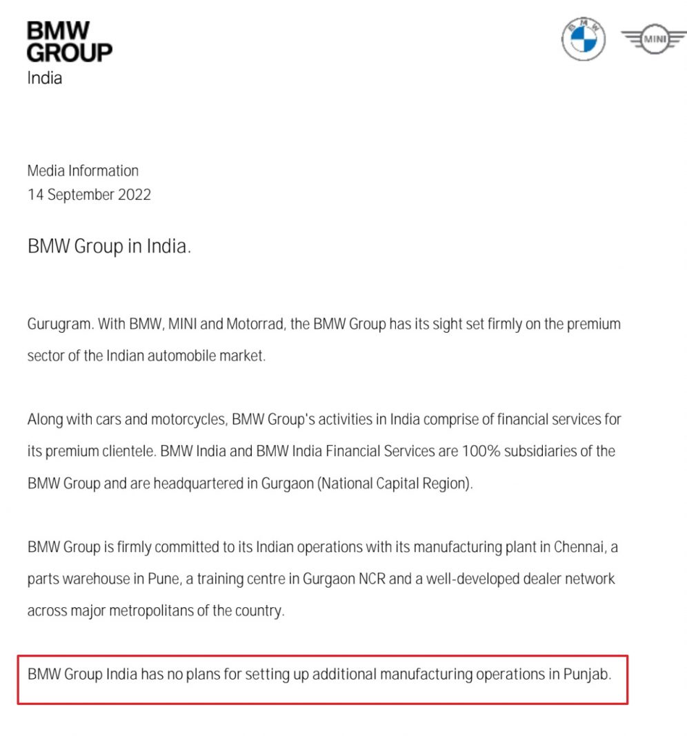 The company said that “BMW Group is firmly committed to its Indian operations with its manufacturing plant in Chennai, a parts warehouse in Pune, a training centre in Gurgaon NCR and a well-developed dealer network across major metropolitans of the country,” and it has no plans to make additional investment for a new plant in Punjab.