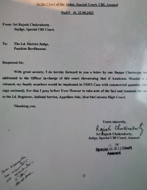 Asansol SPL CBI court judge Rajesh Chakraborty claims of getting a threat letter demanding bail for Anubrata Mondal or else his family will be implicated in an NDPS case with a commercial quantity