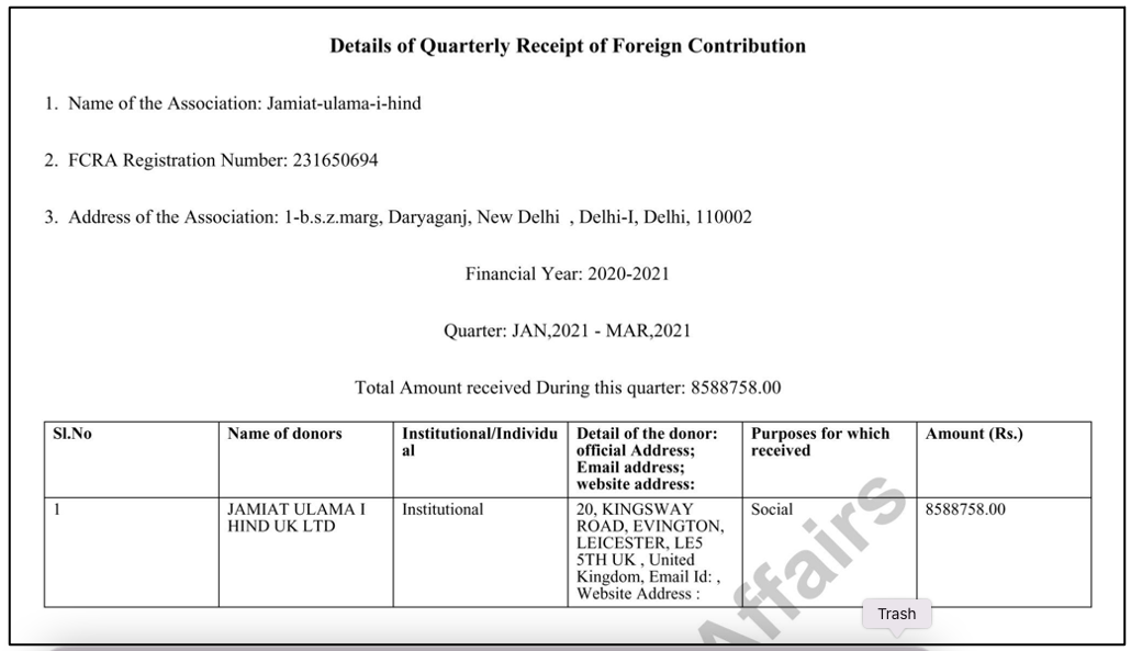 A sample FCRA record of Jamiat Ulama-I-Hind shared by Madhu Kishwar