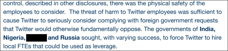 In Section 74 of the document titled ‘Squeezing Local Staff,’ Mudge alleged that India, Nigeria, and Russia had sought and succeeded to a varied extent to “force Twitter” to hire local full-time employees that “could be used as leverage.” If the allegation is understood correctly here, Mudge is claiming that the countries where Twitter has physical offices “forced” the company to hire locals.