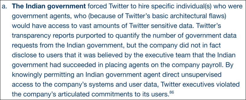 As per the disclosure report, the Indian government “forced” Twitter to hire specific individuals who were government agents. These alleged agents had access to the sensitive information on Twitter “because of Twitter’s basic architectural flaws.” It reads, “Twitter’s transparency reports purported to quantify the number of government data requests from the Indian government, but the company did not, in fact, disclose to users that it was believed by the executive team that the Indian government had succeeded in placing agents on the company payroll. By knowingly permitting an Indian government agent direct unsupervised access to the company’s systems and user data, Twitter executives violated the company’s articulated commitments to its users.”