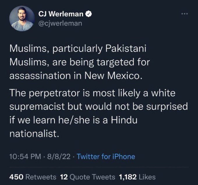 Veteran propagandist, suspected to be on the payroll of ISI, went on to say that the New Mexico killings were probably done by white supremacists. He did not stop there. He went on to say that he would not be surprised if the murders were committed by Hindu nationalists – in New Mexico.