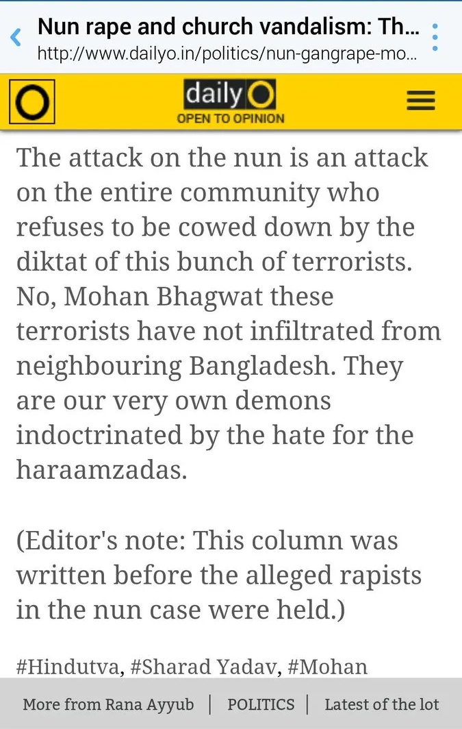 My column on nun rape and church vandalism : Mohan Bhagwat and Subramaniam Swamy are not fringe elements. http://t.co/q1FO77f7P1
