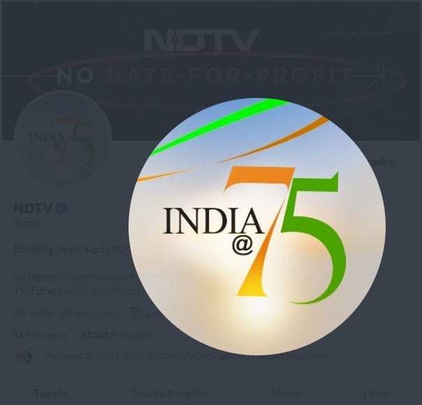 After reverting to its logo for the Twitter DP, NDTV later again changed it to an independence day themed image. The image has the words ‘India @ 75’, with thin saffron and green bands above it. However curiously, the green band is placed above the saffron band, which is opposite of the order of the colours on the national flag.