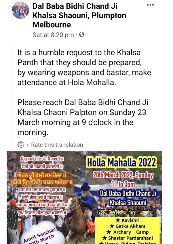 AHM went on to share a post from Plumpton Gurudwara that urged the “Khalsa Panth” to be “…prepared by wearing weapons…” to the event on 23 March 2022.