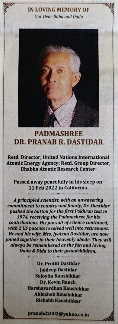 Dastidar, who passed away on February 11, 2022, in California, was a Padmashree recipient. He was a principled scientist who played a key role in the development and design of the reactor of India’s indigenous nuclear submarine INS Arihant.