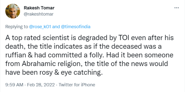 “A top-rated scientist is degraded by TOI even after his death, the title indicates as if the deceased was a ruffian & had committed a folly. Had it been someone from the Abrahamic religion, the title of the news would have been rosy & eye-catching,” remarked one Rakesh Tomar.