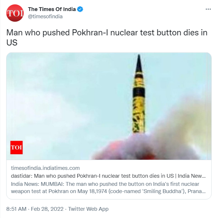 On Monday (February 28), leading English daily ‘The Times of India’ courted controversy for trivialising the achievements of Pokhran-I scientist Pranab Dastidar in an obituary.