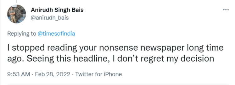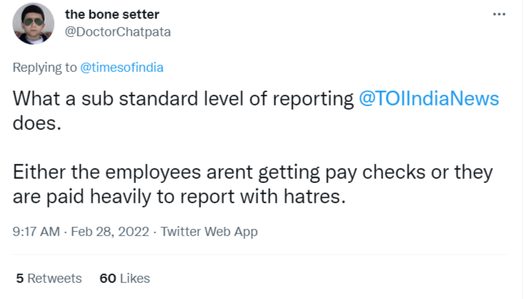 “What a sub-standard level of reporting, TOI news does. Either the employees aren’t getting paychecks or they are paid heavily to report with hatred,” tweeted another user.