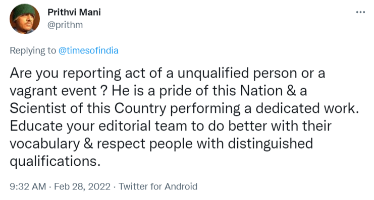 One Prithvi Mani questioned the English Daily, “Are you reporting act of an unqualified person or a vagrant event? He is a pride of this Nation & a Scientist of this Country performing dedicated work. Educate your editorial team to do better with their vocabulary & respect people with distinguished qualifications.”