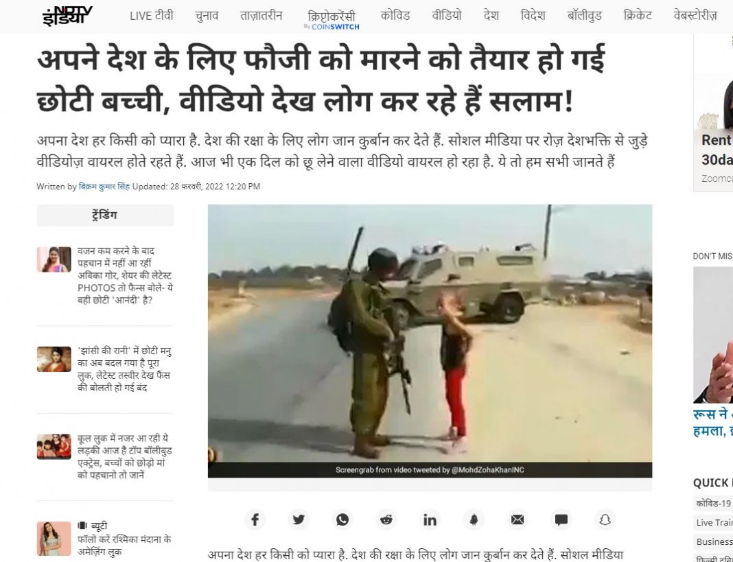 NDTV has once again indulged in spreading fake news by sharing a 10-year-old video of a young girl stating that she is a Ukrainian and is standing up to oppose the Russian invasion. In the viral video, it can be seen that a soldier is standing with a weapon and a little girl starts hitting him. That little girl keeps shouting at the Russian soldier without any fear of death.