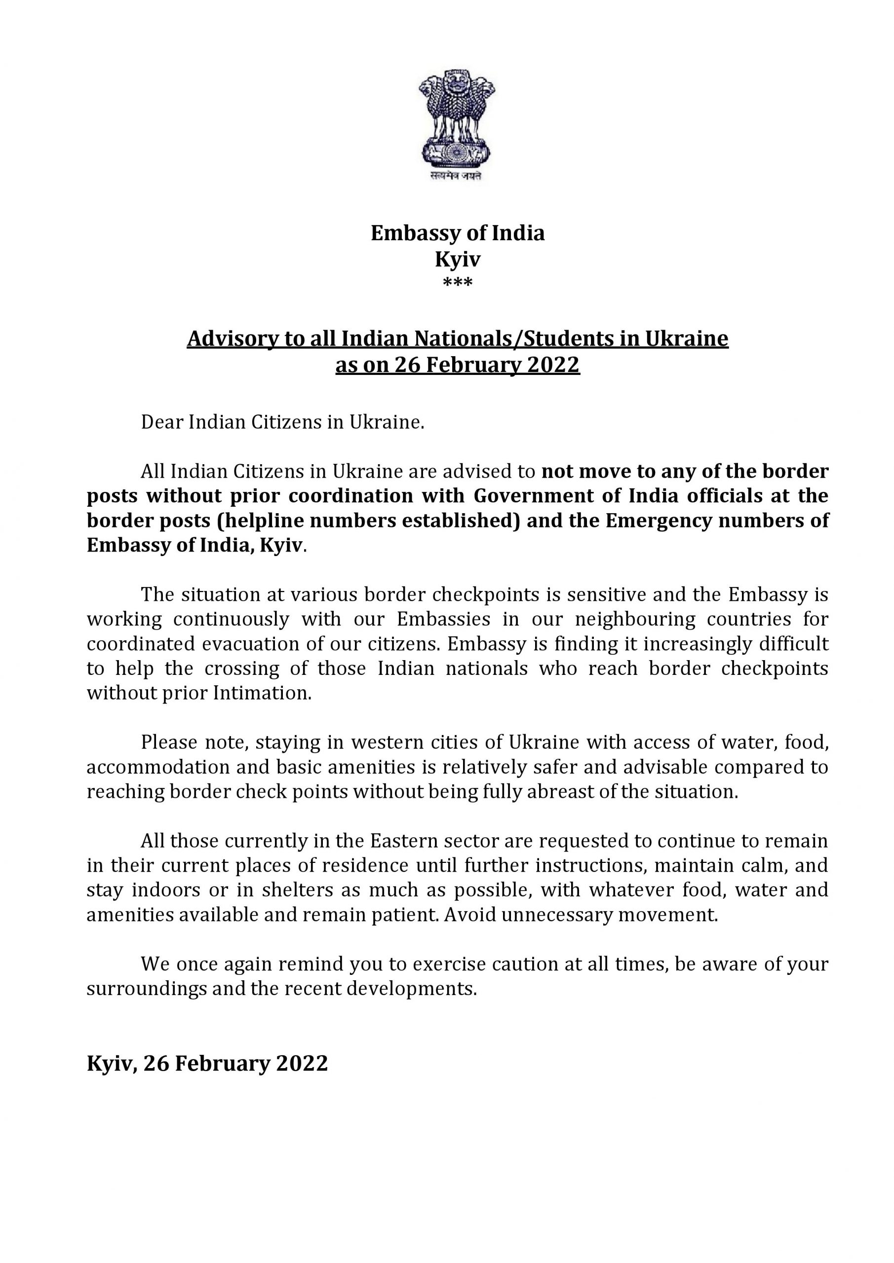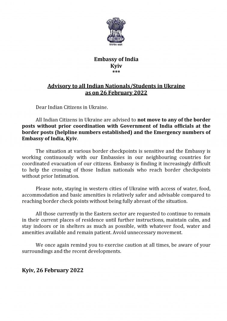 The Indian embassy pointed out that staying in Western Ukraine is relatively safer compared to reaching border checkpoints, without prior knowledge of the situation. It concluded, “All those currently in the Eastern sector are requested to continue to remain in their current places of residence until further instructions, maintain calm, and stay indoors or in shelters as much as possible, with whatever food, water and amenities available and remain patient. Avoid unnecessary movement.”
