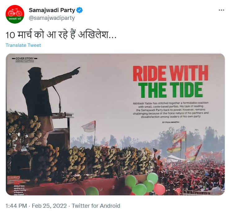 The Twitter handle of the Samajwadi Party shared a post writing “Akhilesh is coming on March 10” (Translated from Hindi). The post was shared at 01:44 PM. It has a photo attached which contains the headline “Ride With The Tide.” Under the slogan, there are some lines that are critical to the Samajwadi Party Itself.
