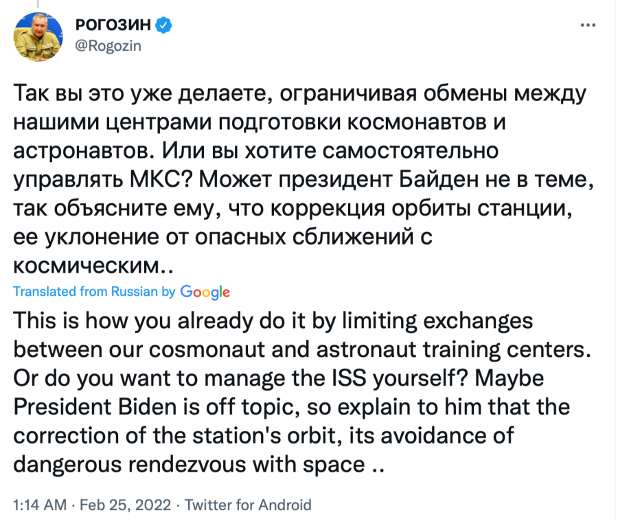 “This is how you already do it by limiting exchanges between our cosmonaut and astronaut training centres. Or do you want to manage the ISS yourself? Maybe President Biden is off-topic, so explain to him that the correction of the station’s orbit, its avoidance of dangerous rendezvous with space garbage, with which your talented businessmen have polluted the near-Earth orbit, is produced exclusively by the engines of the Russian Progress MS cargo ships. “