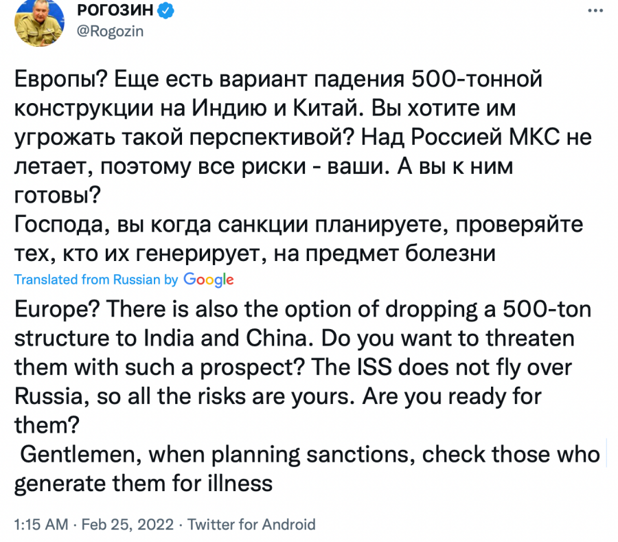 Rogozin continued, “If you block cooperation with us, who will save the ISS from an uncontrolled deorbit and fall into the United States or Europe? There is also the option of dropping a 500-ton structure to India and China. Do you want to threaten them with such a prospect? The ISS does not fly over Russia, so all the risks are yours. Are you ready for them? Gentlemen, when planning sanctions, check those who generate them for illness like Alzheimer’s.”