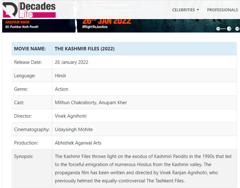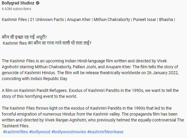 In the description of the movie, NDTV, even before the trailer of the movie was released, declared that the movie was a “propaganda film” written and directed by Vivek Ranjan Agnihotri who had previously made a “controversial movie” called The Tashkent Files, which basically asked the all-important question, “who killed Lal Bahadur Shastri”.
