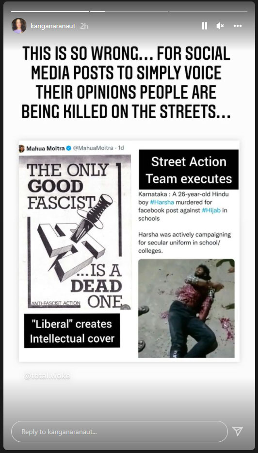 In a story, Actress Kangana Ranaut said, “This is wrong, for social media posts to simply voice their opinions people are being killed on the streets.” She was quoting a post by Instagram handle total.woke where the handle posted how ground reality was different from what is presented in the mainstream media.