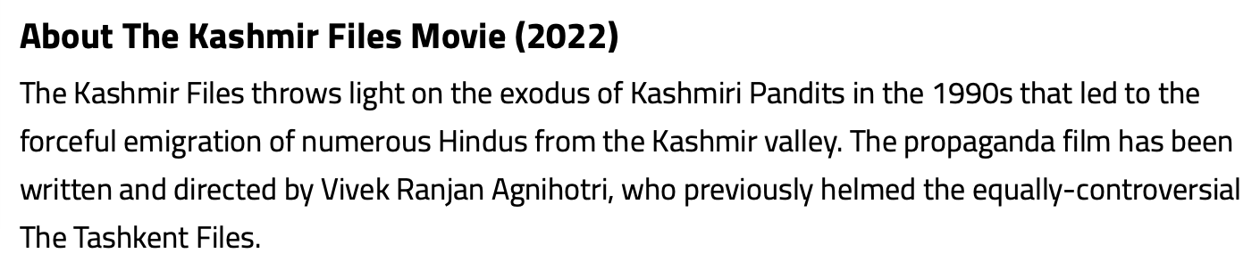 NDTV essentially tried to feed the ‘propaganda movie’ term to internet algorithms so that the term gets linked to the movie about the plight of Kashmiri Pandits, and eventually starts getting displayed in search results. The probability of the term getting displayed will become bigger if more and more websites copy NDTV and an associated Wikipedia or IMDb page is also vandalized to include the term.