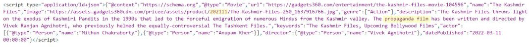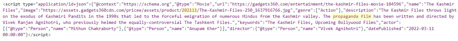 Screenshot of source code of NDTV’s page with ‘propaganda movie’ mentioned in Schema Mark.