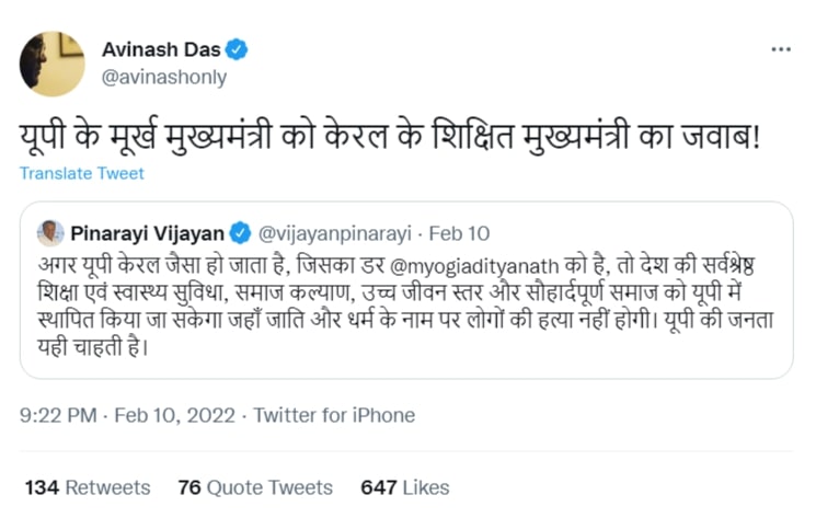 On Thursday (February 10), controversial filmmaker Avinash Das shared a tweet by Pinarayi Vijayan and wrote, “UP’s ignorant Chief Minister received the response of educated Chief Minister of Kerala.” His tweet prompted comparisons between the educational qualifications of the two political leaders.
