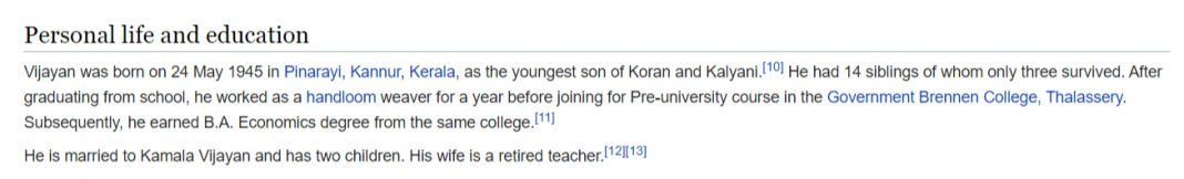 Screengrab of the Wikipedia page of Pinarayi Vijayan