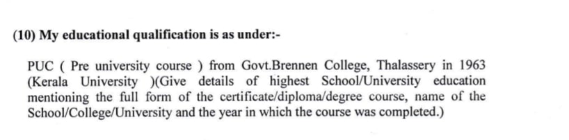 Under the column that sought details of his highest school/University education, the incumbent Kerala CM wrote, “PUC (Pre Univeristy Course) from Govt. Brennen College, Thalassery in 1963 (Kerala University).”