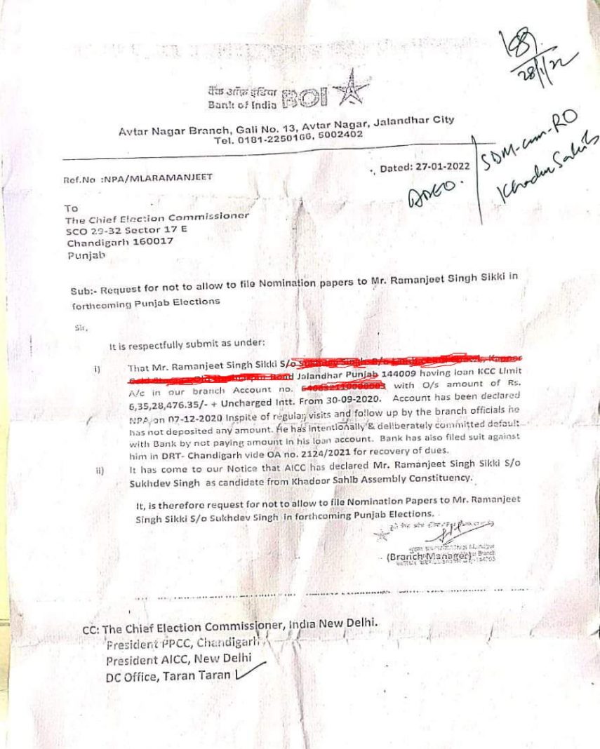The bank has written that Congress Party has declared Sikki as their MLA candidate from the Khadoor Sahib constituency. They have requested the Election Commission of India to not allow Sikki to file his nomination for the upcoming state assembly elections.