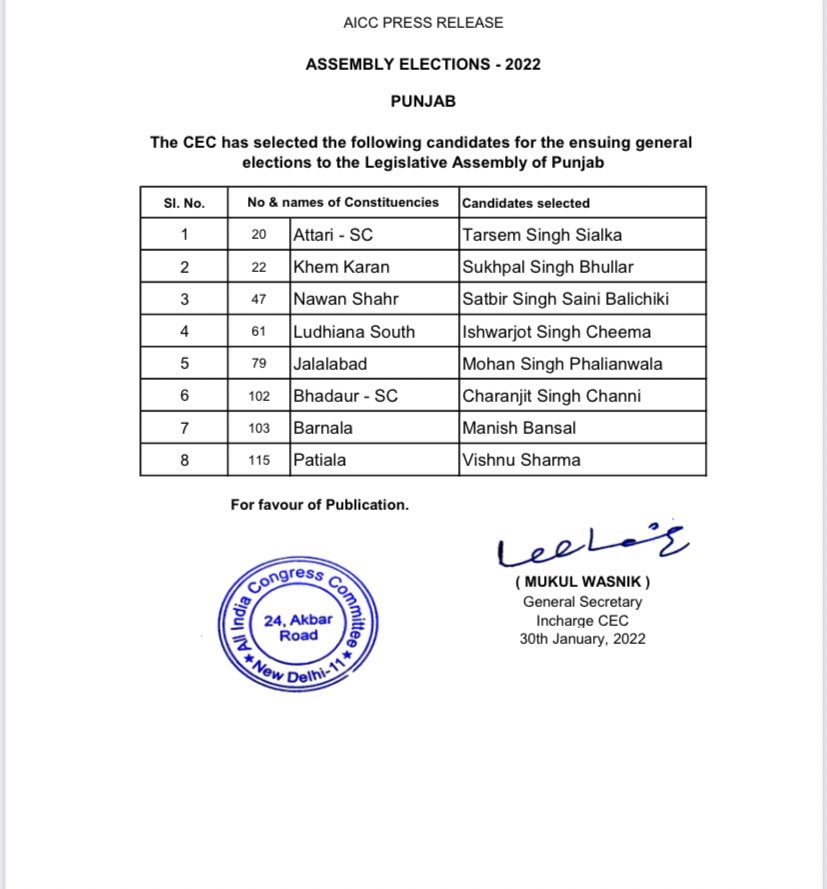 List of eight candidates released by the Congress, which includes the candidacy of Charanjit Singh Channi from Bhadaur, Barnala