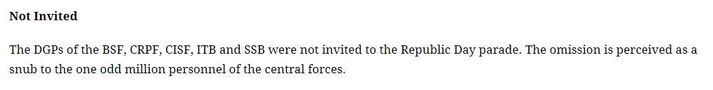 The report read, “The DGPs of the BSF, CRPF, CISF, ITB, and SSB were not invited to the Republic Day parade. The omission is perceived as a snub to the one odd million personnel of the central forces.” The claim appeared in an opinion piece titled “Why PM Modi wasted no time in installing Netaji’s statue” by Coomi Kapoor, where it was added under the section titled ‘Not Invited’.