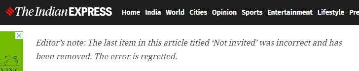 After the individual CAPFs refuted the report, Indian Express removed the ‘Not Invited’ section from the article. It added an Editor’s note saying “The last item in this article titled ‘Not invited’ was incorrect and has been removed. The error is regretted.“