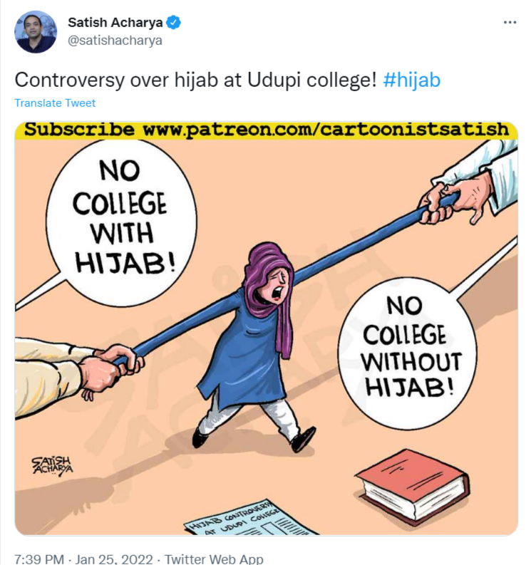 The cartoon by Satish Acharya depicted a ‘Muslim woman’ clad in a hijab (head scarf) and being caught in the middle of two groups. While one group directed the girl that she cannot attend college with a hijab, the other group told her ‘no college without hijab.’