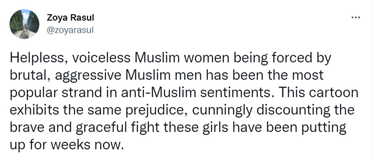 In a tweet, popular ‘news grazer’ Zoya Rasul claimed, “Helpless, voiceless Muslim women being forced by brutal, aggressive Muslim men has been the most popular strand in anti-Muslim sentiments. This cartoon exhibits the same prejudice, cunningly discounting the brave and graceful fight these girls have been putting up for weeks now.”