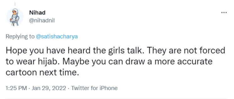 In another tweet, one Nihad said, “Hope you have heard the girls talk. They are not forced to wear hijab. Maybe you can draw a more accurate cartoon next time.”