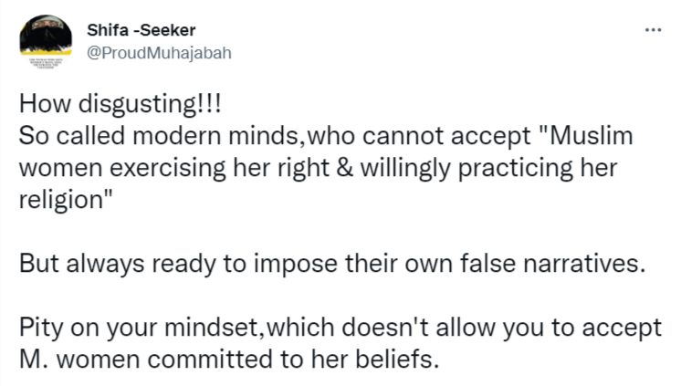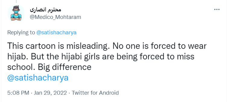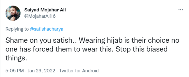 Another Islamist claimed, “Shame on you Satish. Wearing hijab is their choice. No one has forced them to wear this. Stop these biased things.”